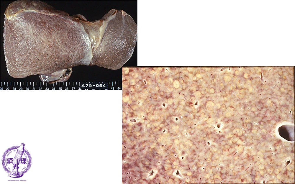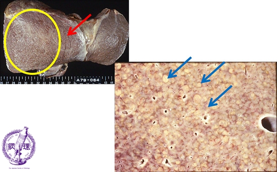 Macroscopic image: The liver surface is dark reddish and irregular (yellow circle) with creases (red arrow, upper left). Upon sectioning, the cut surface shows many areas of expanding yellowish discoloration which correspond to necrotic foci (blue arrows).