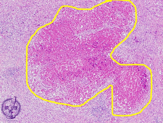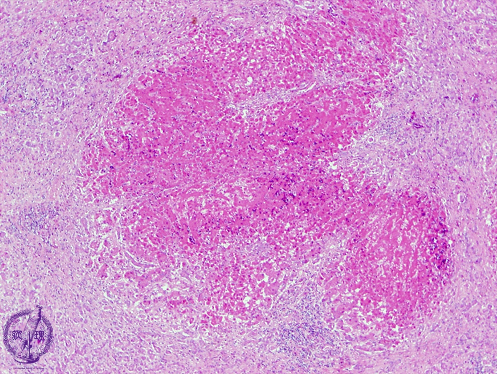 Microscopic finding (HE stain, low power view): Irregular necrotic foci show eosinophilic change.