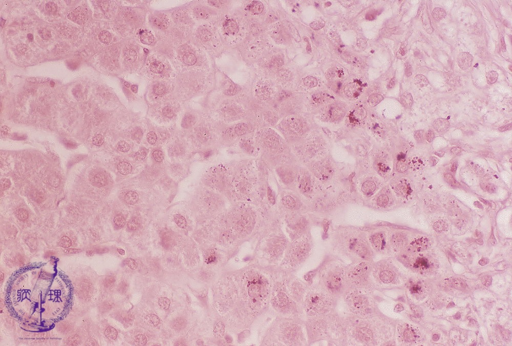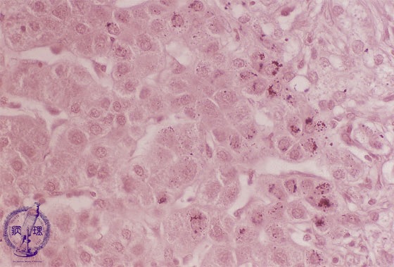 Microscopic image (orcein stain, high power): In advanced primary biliary cirrhosis, periportal hepatocytes contain orcein positive cytoplasmic granules. Orcein stains copper binding protein; therefore, positively staining granules reflect the deposition of copper granules associated with chronic cholestasis.