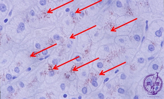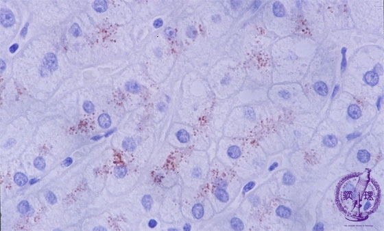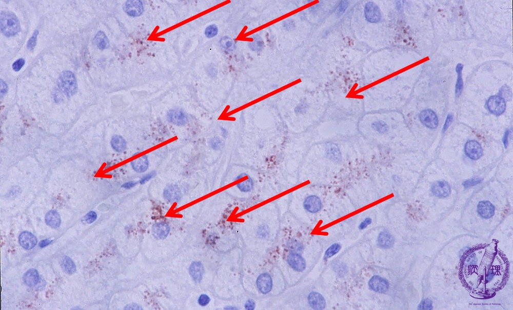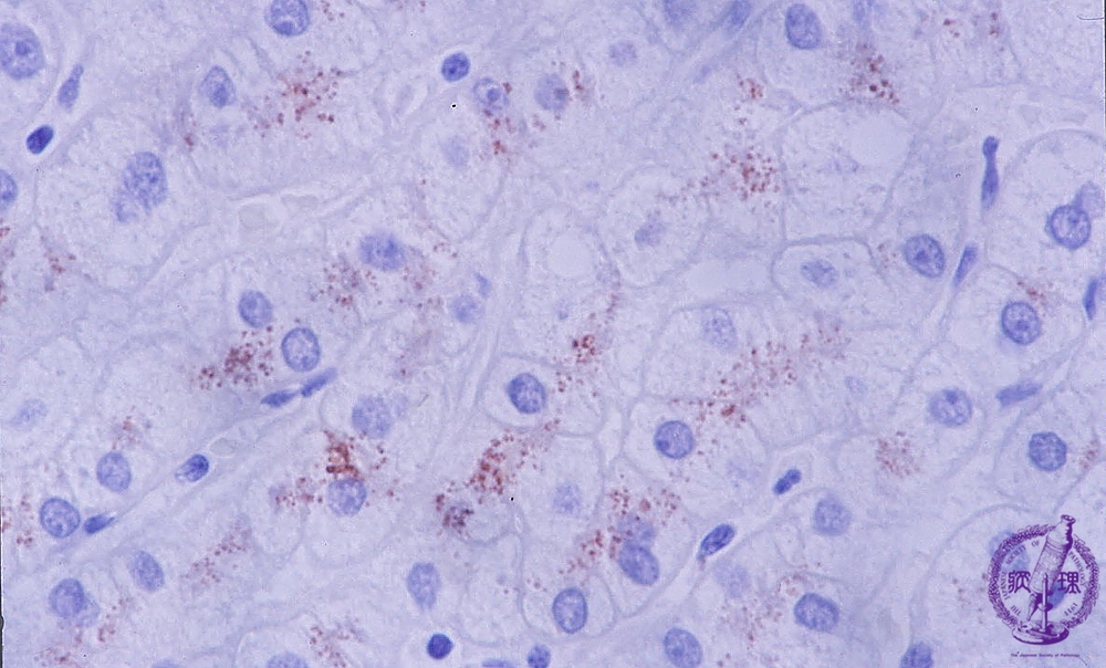 Microscopic image (copper stain (rubeanic acid stain), high power): Reddish brown staining copper granule deposits are seen mostly within the hepatocytes adjacent to bile canaliculi and are predominantly perinuclear.
