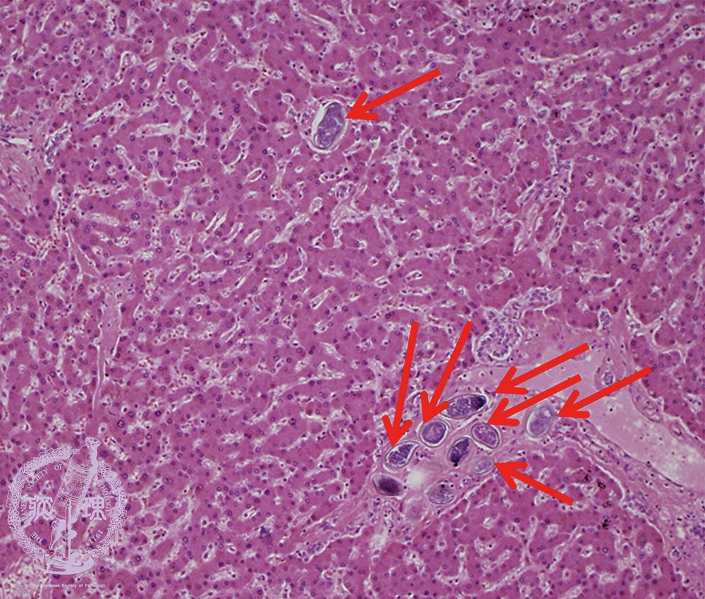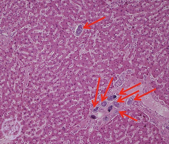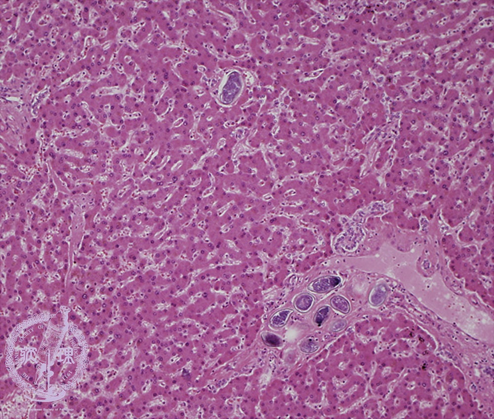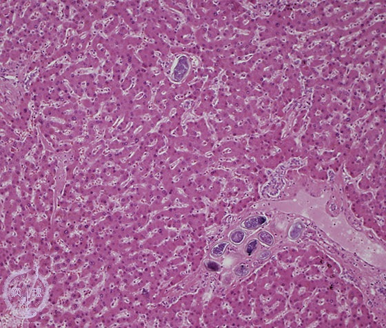 Microscopic image (HE stain, intermediate power) Parasite eggs are found in the portal and central veins. Fibrosis is inconspicuous.