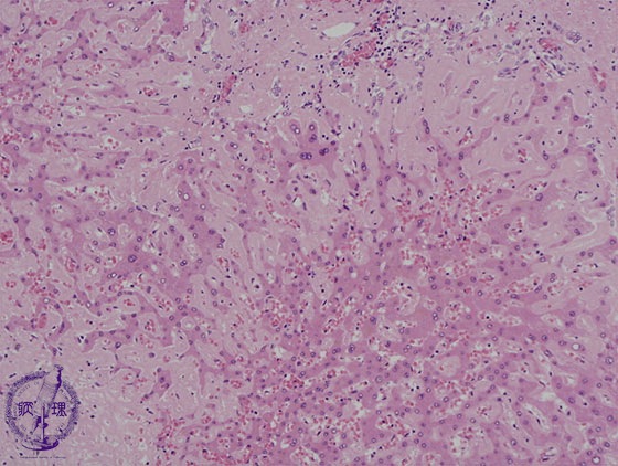Microscopic image (HE stain, high power): There is deposition within sinusoids of a pink amorphous material (amyloid) and hepatocytes are atrophic.