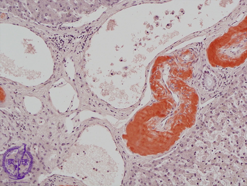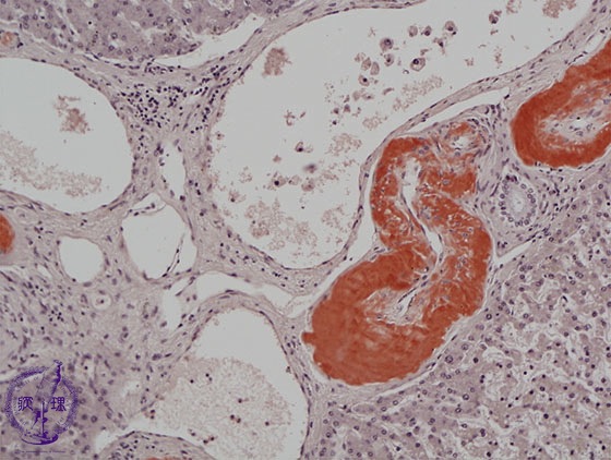 Microscopic image (Congo red stain, high power): There is deposition of an amorphous orange staining material within the portal area and thickened arterial walls.