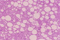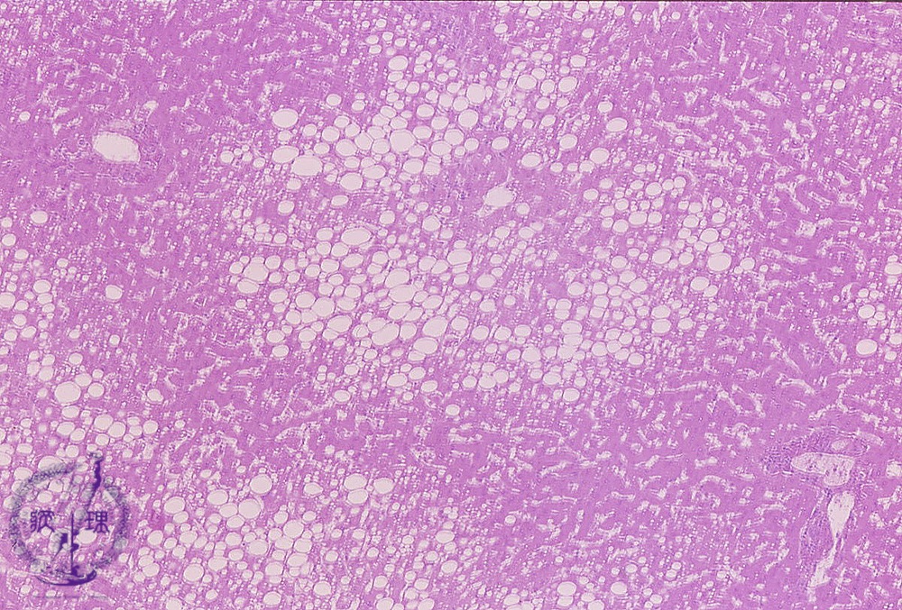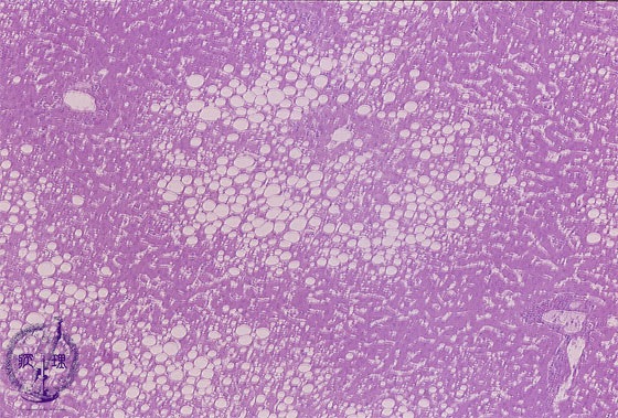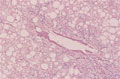 Microscopic image (HE stain, low power): There is macrosteatosis of centrilobular hepatocytes. Hepatic lobular architecture is maintained.