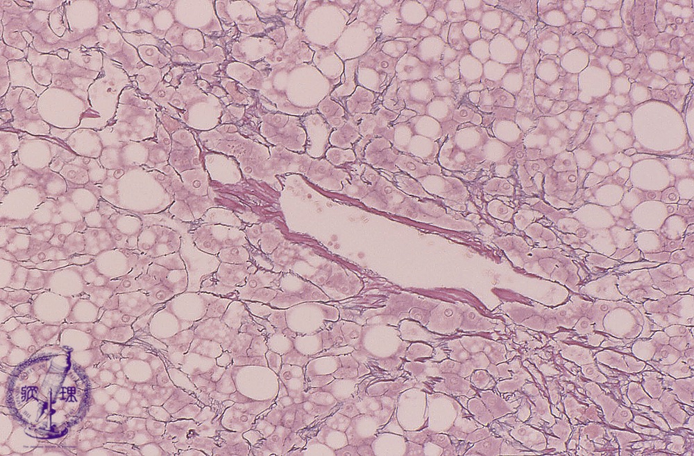 Microscopic image (silver stain, high power): Centrilobular hepatocytes demonstrate pericellular fibrosis and central vein walls are thickened. There is macrosteatosis.