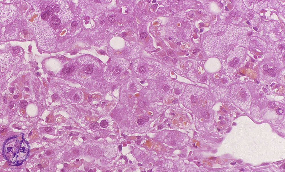 Microscopic image (HE stain, high power): Multiple concentrated bile plugs are scattered within bile canaliculi and swollen hepatocytes contain cytoplasmic bile pigment. Mildly swollen Kupffer cells and a minimal steatosis are seen.