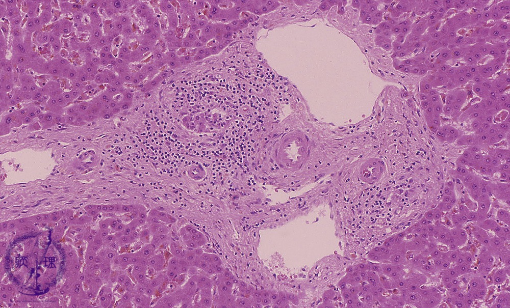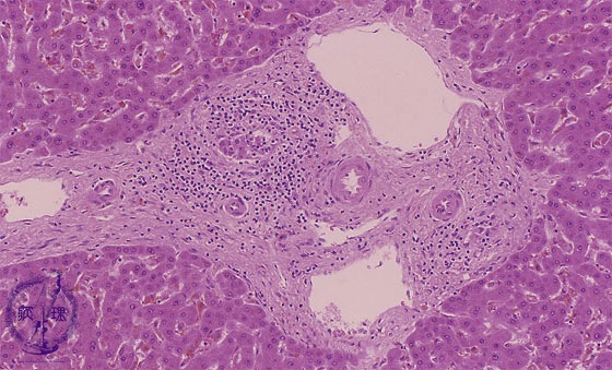 Microscopic image (HE stain, intermediate power): Mid-sized portal areas show fibrosis and inflammatory infiltrates composed mainly of lymphocytes. Damaged (?) interlobular bile ducts, surrounded by an inflammatory reaction, are gradually destroyed.