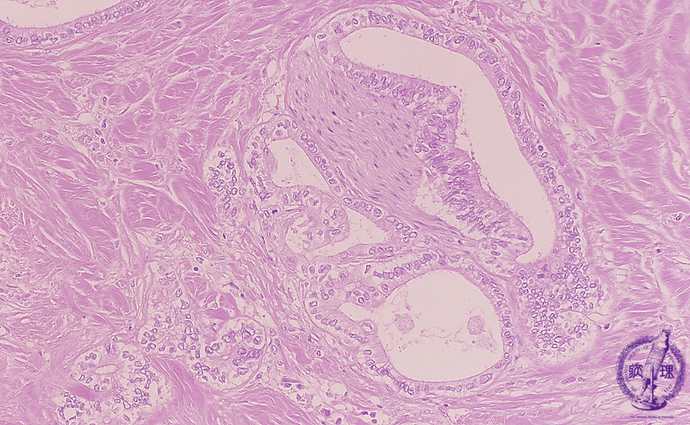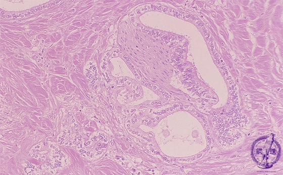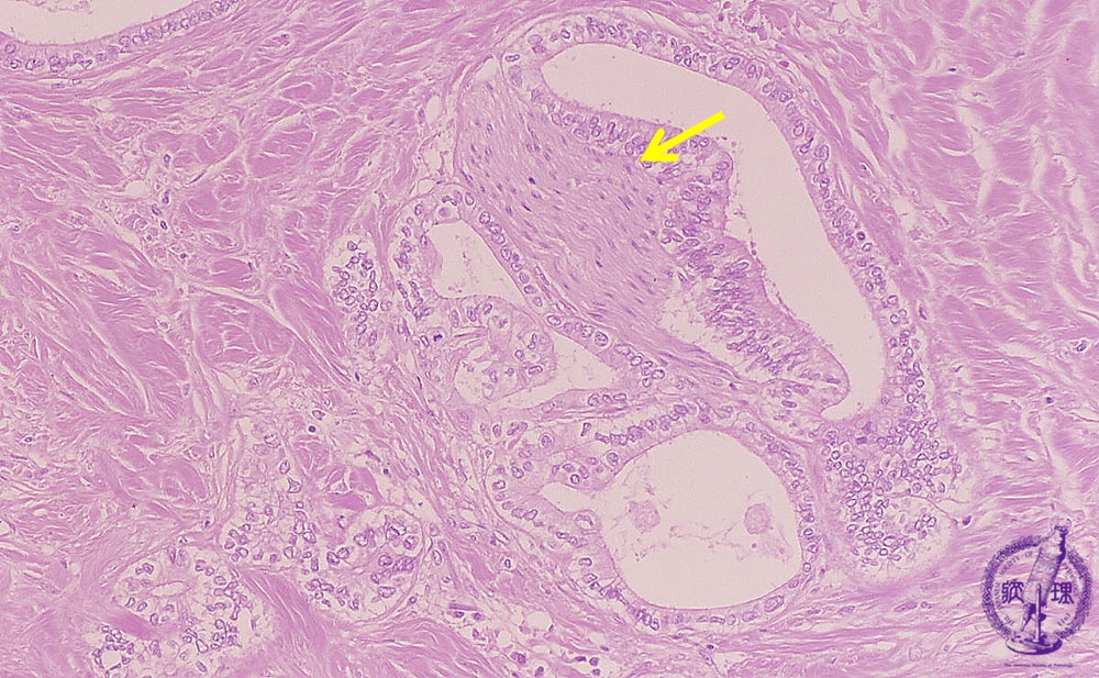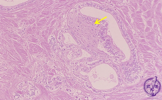 Microscopic image (HE stain, intermediate power): Neuronal invasion (yellow arrow) by tubular adenocarcinoma is seen.