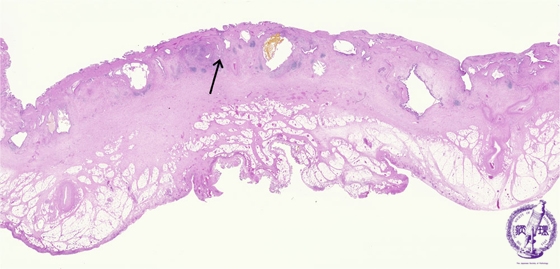 Microscopic image(HE stain, loupe view):The gallbladder is markedly thickened with fibrosis which involves the mucosal, muscular, and subserosal layers. Many epithelial lined cyst-like invaginations form sinus tracts which penetrate the muscularis into the subserosa (Rokitansky-Aschoff sinuses). At the center, bile congestion (tan) is observed in a Rokitansky-Aschoff sinus.