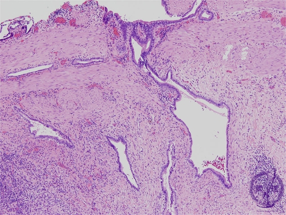 Microscopic image(HE stain, intermediate power):A (Rokitansky-Aschoff) sinus is observed as an invagination of the mucosa through the muscularis, into the subserosa. Nearby, there is fibrosis and a chronic, predominantly lymphocytic infiltrate.