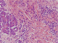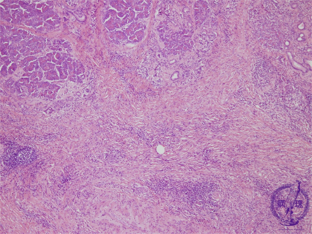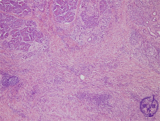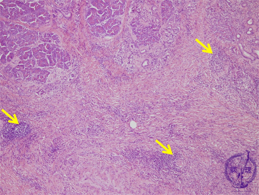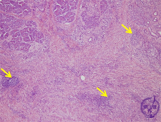 Microscopic image(HE stain, low power): Advanced fibrosis is seen within the pancreatic parenchyma and interlobular spaces. Lymphoid follicles are seen forming amongst the fibrosis (arrows).