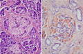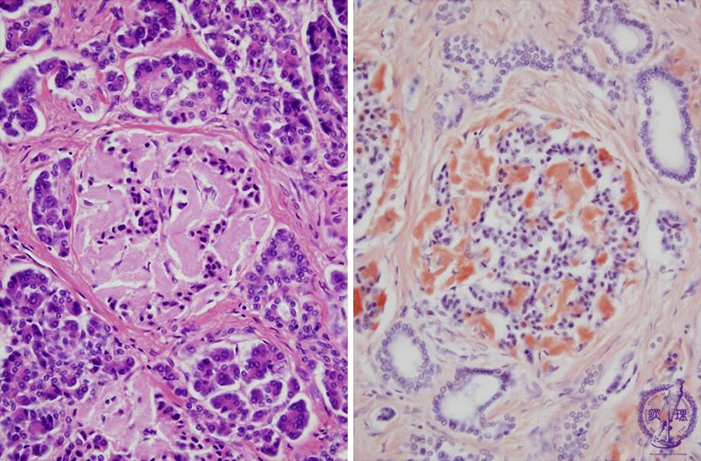 Microscopic findings(HE stain, high power):Deposits of an amorphous, eosinophilic material within the islets of Langerhans contain amyloid proteins/deposits as demonstrated by the positive Congo red stain (right).