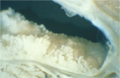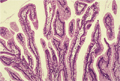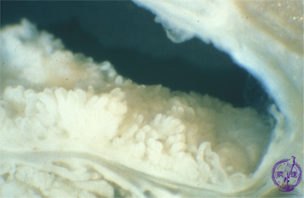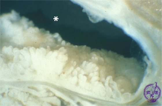 Macroscopic findings (resection specimen, dissecting microscope image):(IPMA: intraductal papillary- mucinous adenoma)Proliferating, papillary lesions are seen within dilated pancreatic ducts (*). Pancreatic duct dilation is typically due to voluminous mucus produced by the tumor.