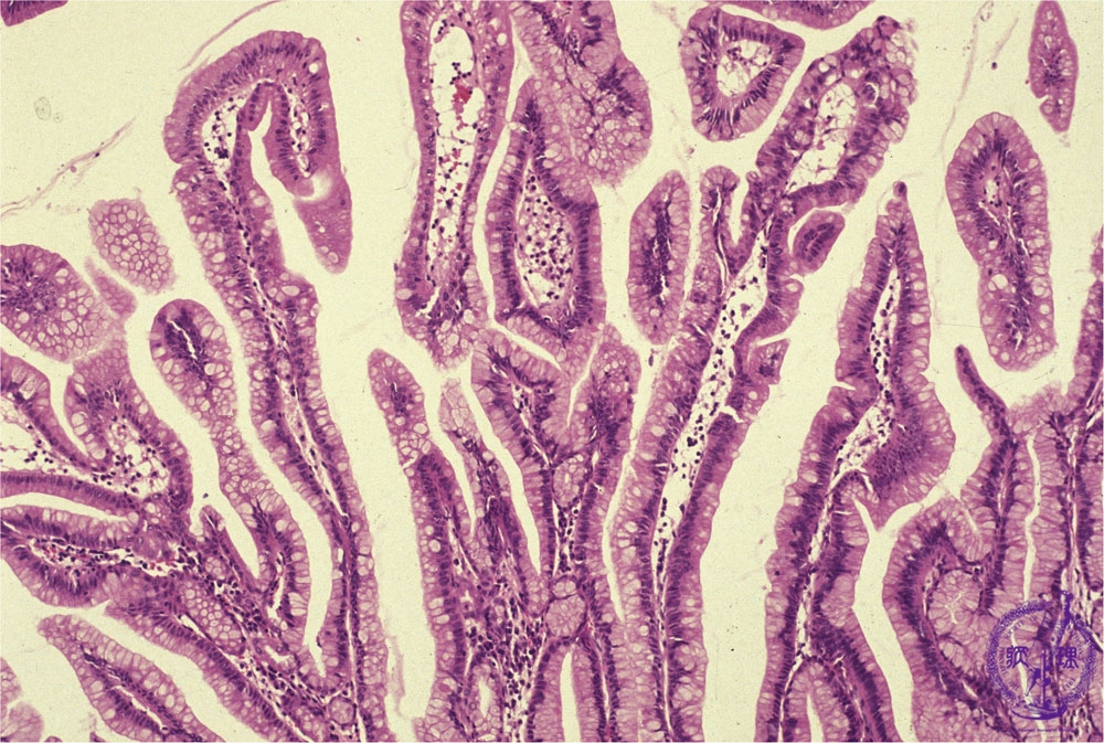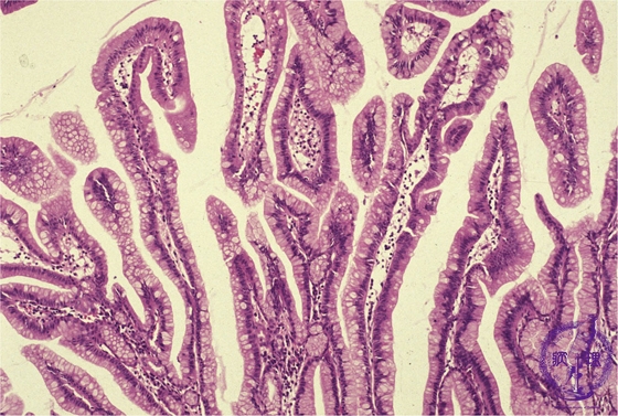 Microscopic view (HE stain, mid-power): (IPMA)The papillary proliferation is lined by tall columnar, mucin rich cells. Histologically, papillae have abundant stroma and the lining epithelial cells contain small, uniform and non-stratified, basally oriented nuclei consistent with moderate atypia (intermediate-dysplasia) IPMN.