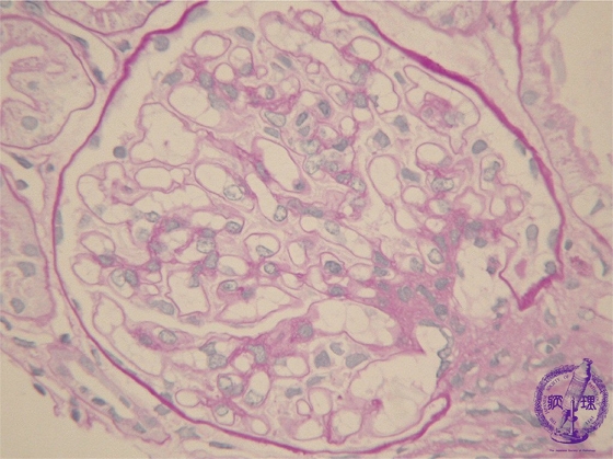 Microscopic findings (PAS, high power view): The basement membrane is not thickened and contains no deposits.