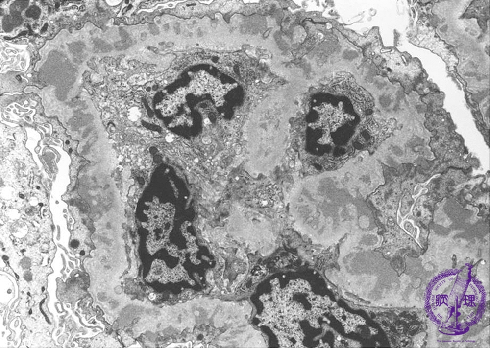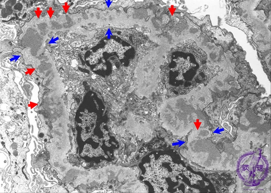 Electron microscopic findings, stage III: The electron dense subepithelial deposits (red arrow) are completely enveloped by thickened basement membrane (blue arrow).