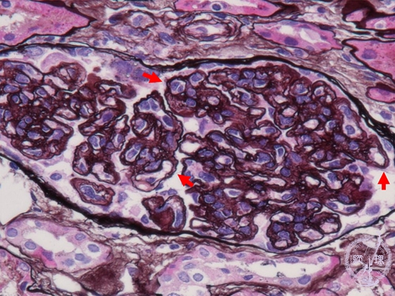 Microscopic findings ( PAM, high power view): The glomerular basement membrane is irregularly thickened and demonstrates a double contour (red arrows).