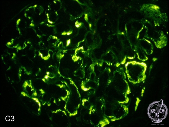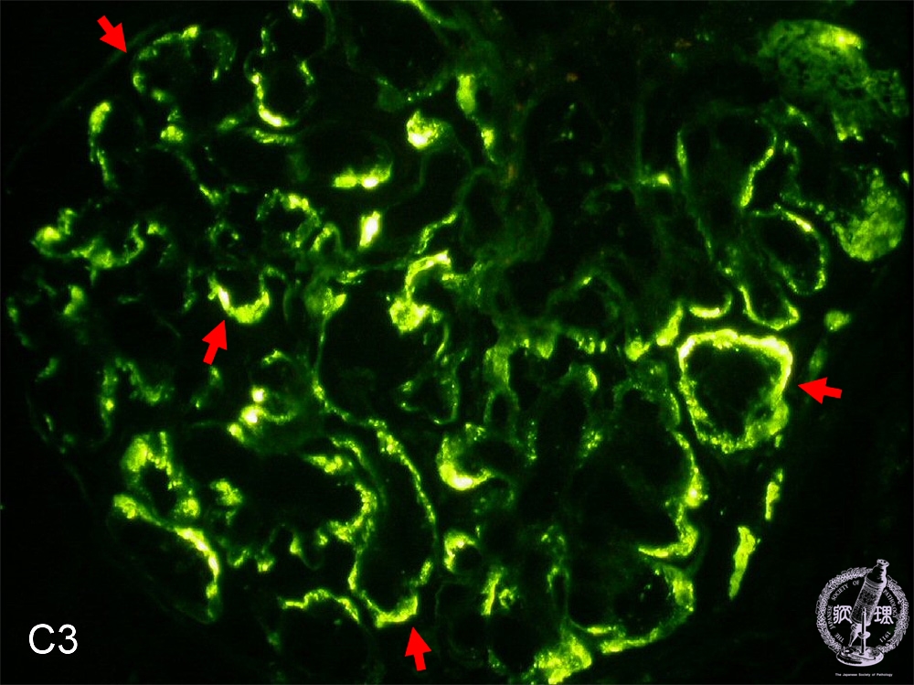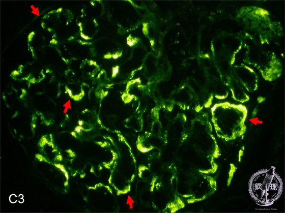 Microscopic findings (immunofluorescence microscopy, high power view): C3 deposits are seen situated along the glomerular capillary loops (red arrows).
