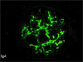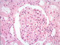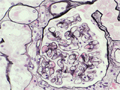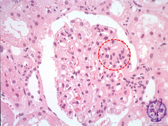 Microscopic findings (HE, high power view): Slight expansion of the mesangium is noted (area within red dotted line).