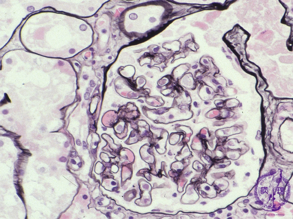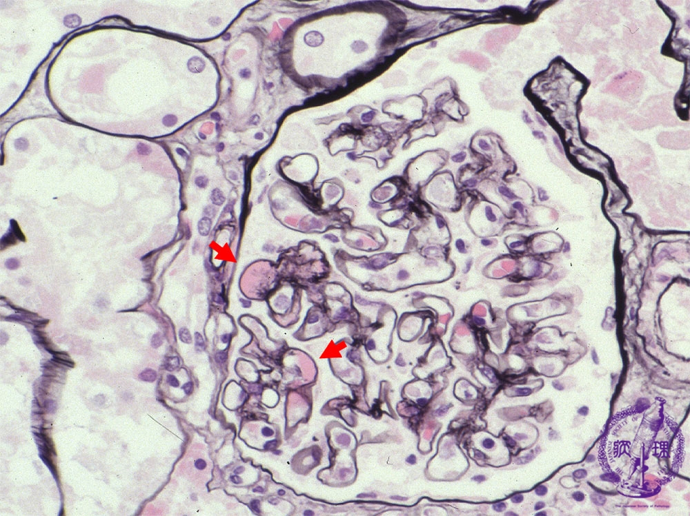 Microscopic findings ( PAM, high power view): In the mesangium, there are hemispheric deposits (red arrows) corresponding to IgA deposition.