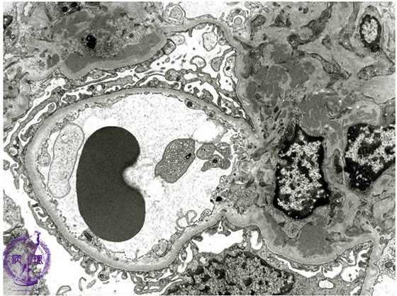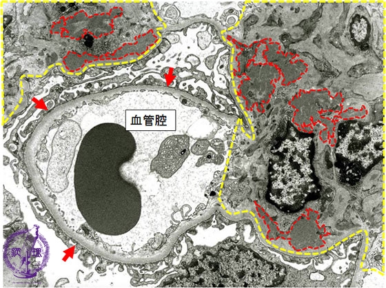 Microscopic findings (electron microscopy): In the mesangium (yellow dotted line), there is are electron dense deposits (red dotted line). The basement membrane is not thickened (red arrows).