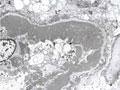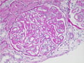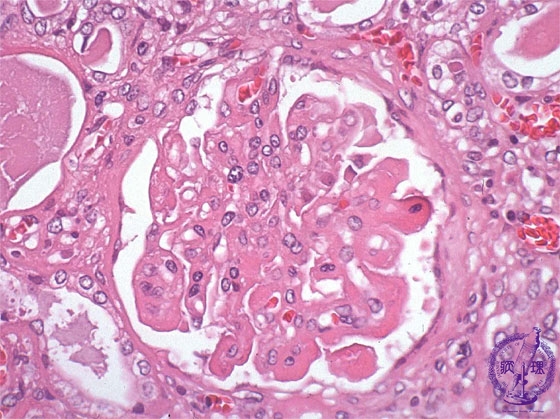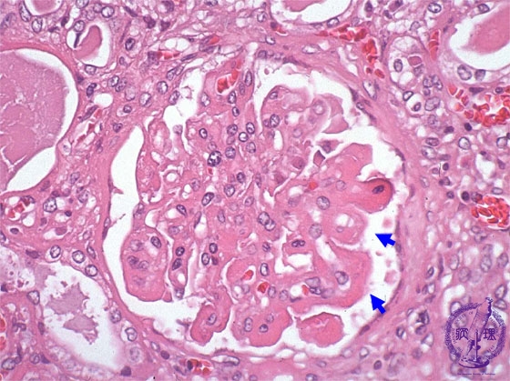 Microscopic findings ( HE, high power view): The basement membrane is markedly thickened and the classic wire-loop lesion is seen (blue arrows). There is focal mesangial cell proliferation.