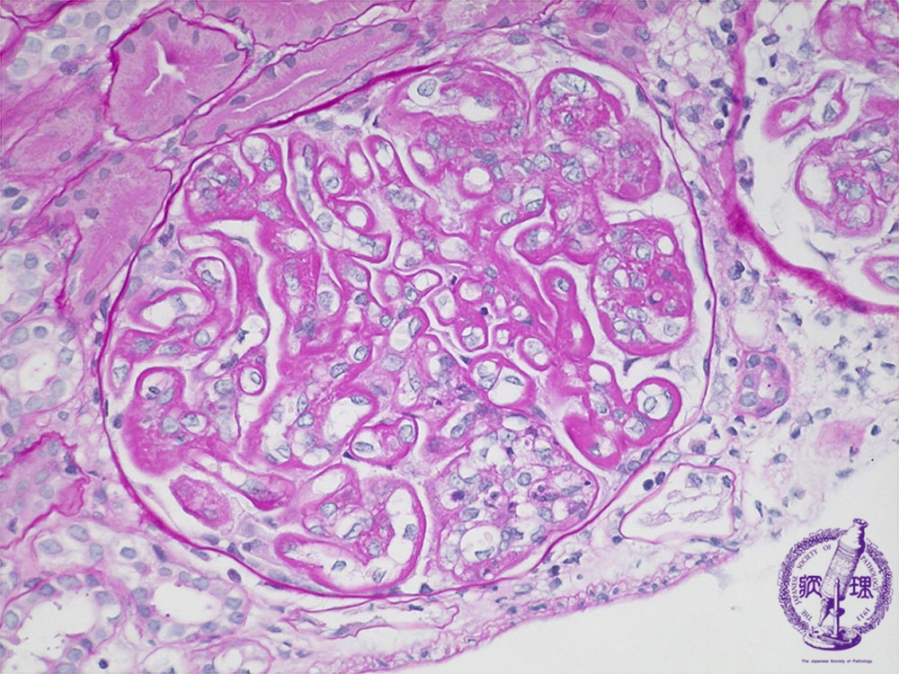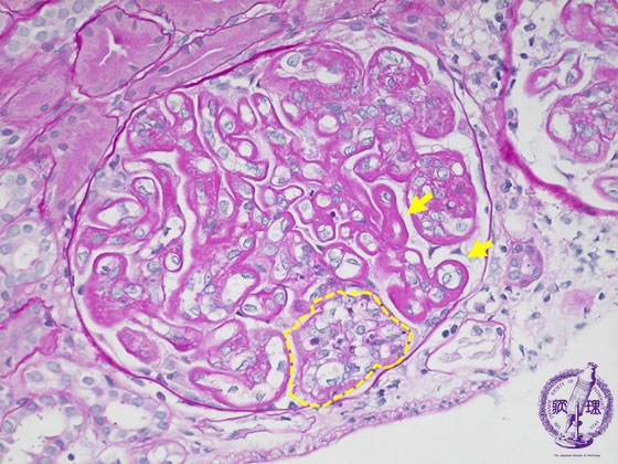 Microscopic findings ( PAS, high power view): The basement membrane is markedly thickened and has a wire-loop appearance (yellow arrows). An endocapillary cellular proliferation containing neutrophil aggregates is focally observed (yellow dotted line).
