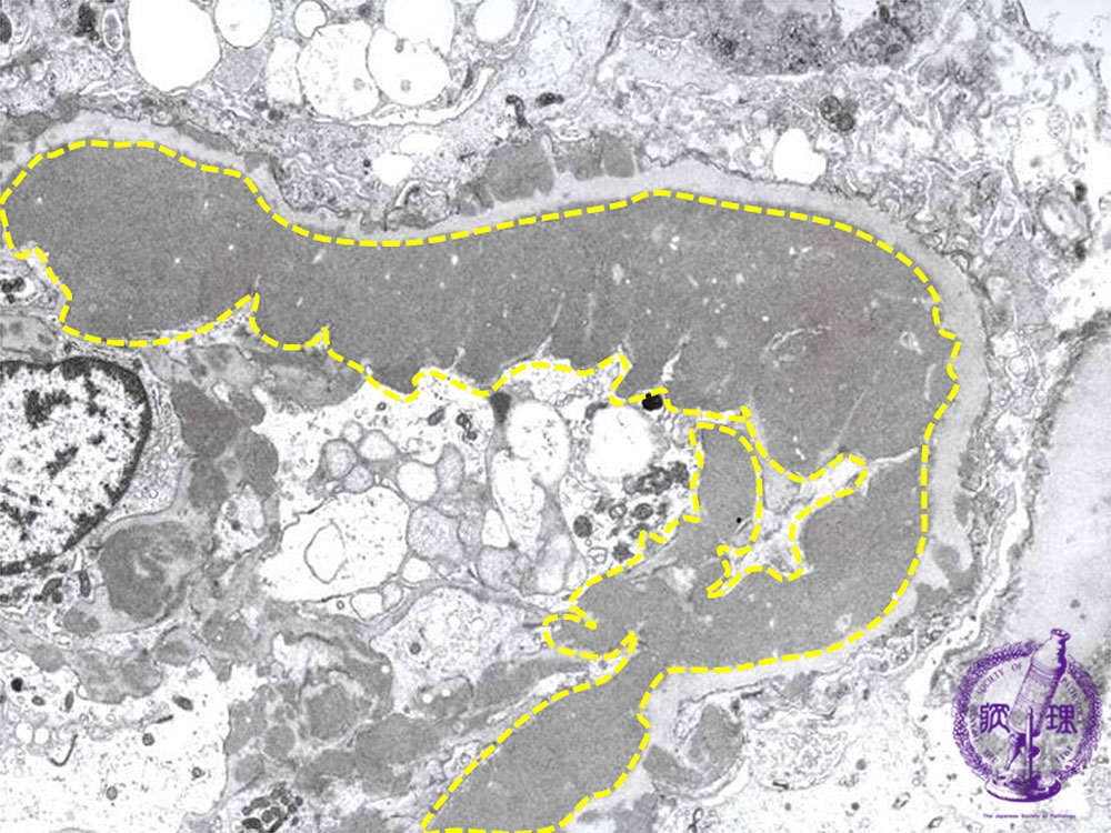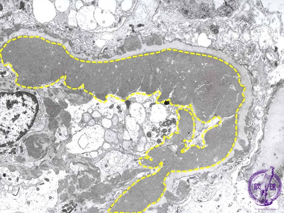 Microscopic findings (electron microscopy): There are electron dense subendothelial deposits (yellow dotted line) which correspond to the wire-loop lesion.
