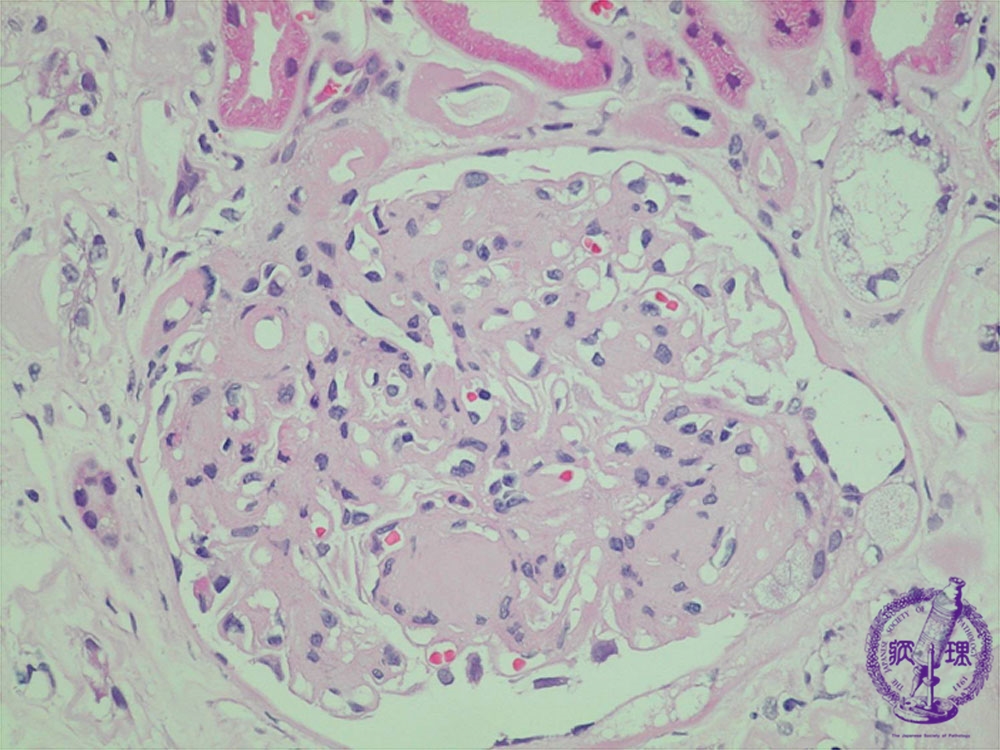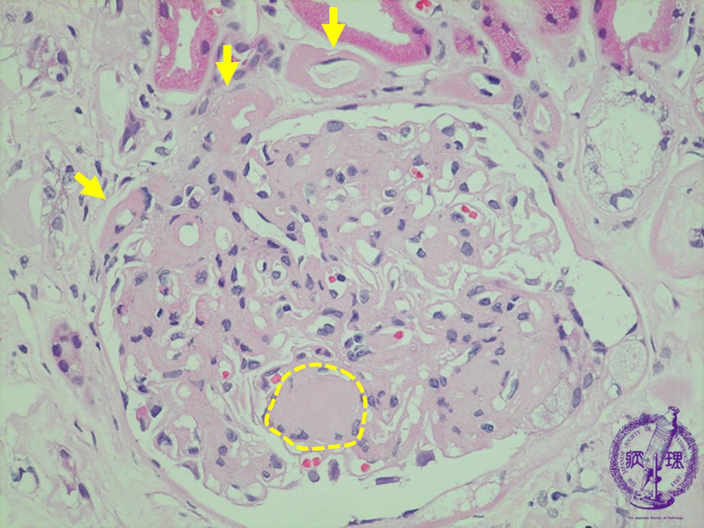 Microscopic findings (HE, high power view): Nodular lesion. Eosinophilic material forms nodular deposits (yellow dotted line) within the mesangium pushing mesangial cells to the periphery, the quintesessential finding in diabetic nephropathy. There is arteriolosclerosis demonstrated by marked hyalinization in the walls of afferent and efferent arteries and arterioles. (yellow arrows).