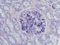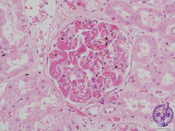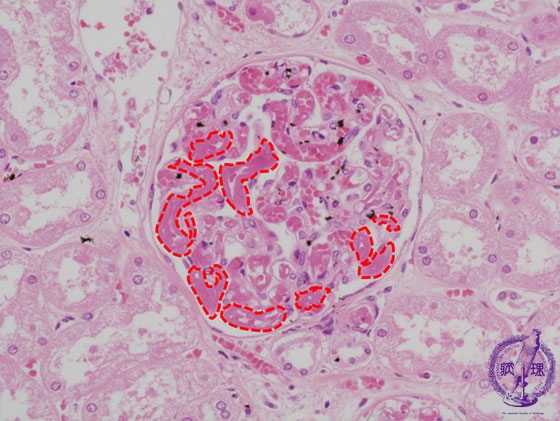 Microscopic findings ( HE,high power): Fibrin microthrombi within capillaries of glomerular loops (red dotted line).