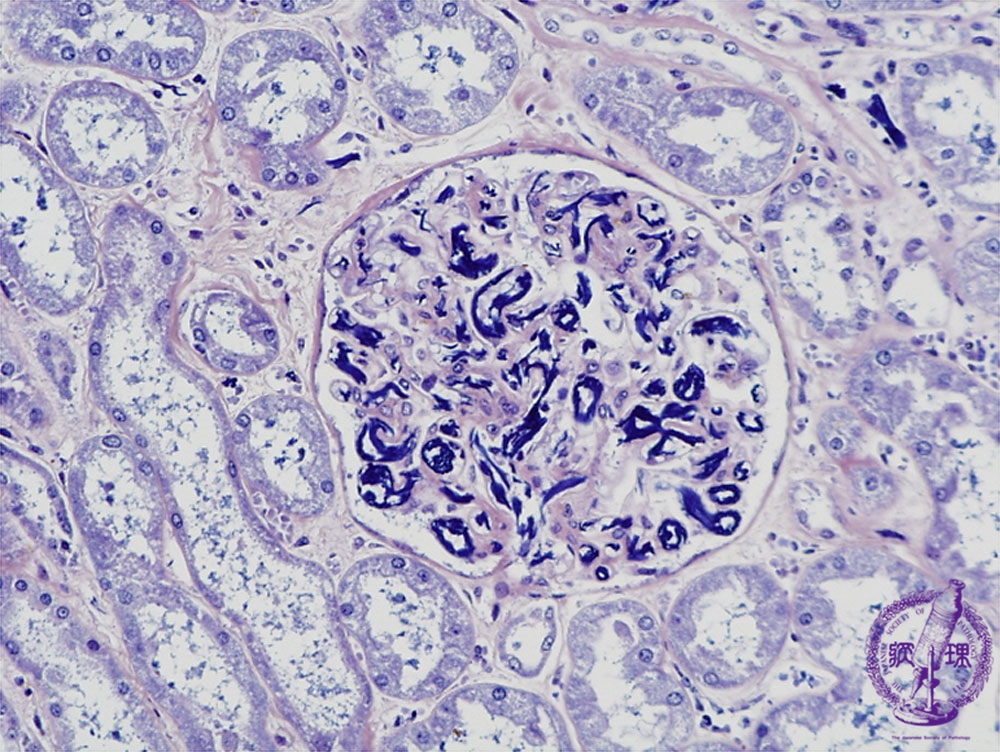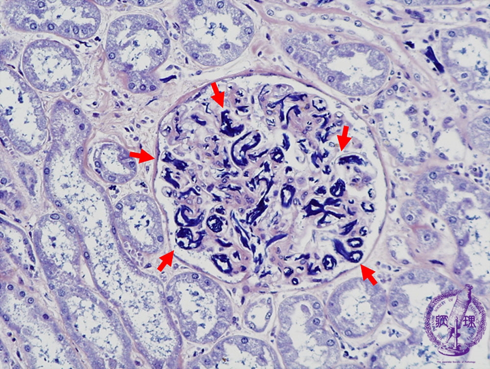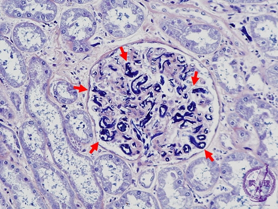 Microscopic findings (PTAH, high power view): Microthrombi within glomerular capillary lumens are highlighted by PTAH which stains nuclei and fibrin blue (red arrows).