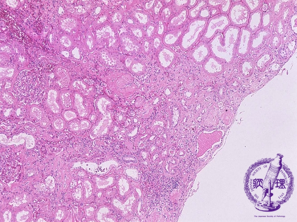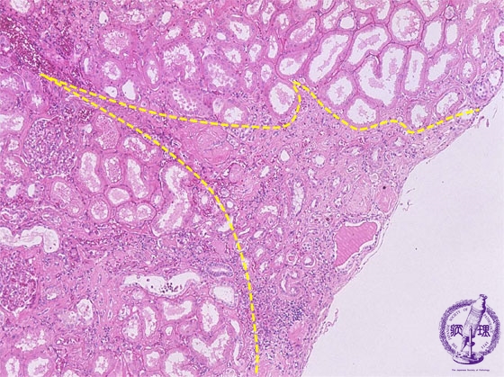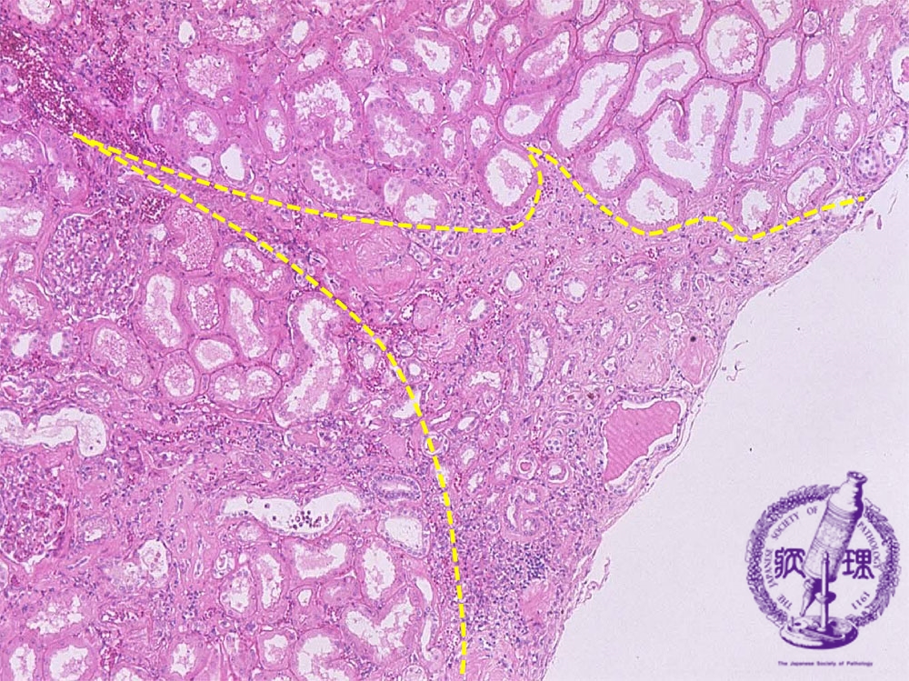 Microscopic image (HE, mid-power): The cortex shows wedge-shaped atrophy (yellow dotted line) with scar and a mononuclear cell infiltrate.