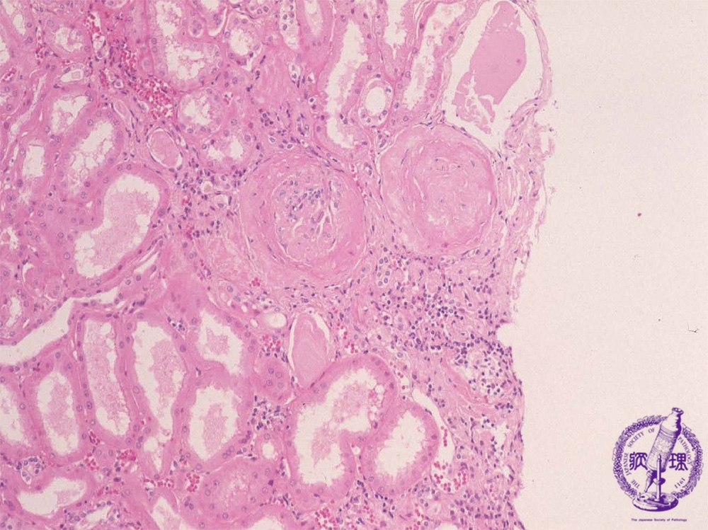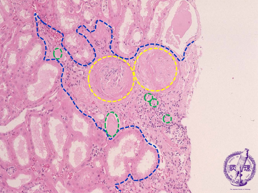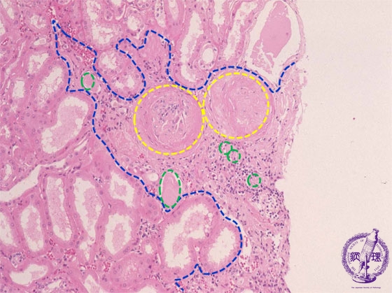 Microscopic findings (HE, middle power view): The wedge-shaped compressed region (blue dotted line) shows sclerosis of the glomeruli (yellow dotted lines) and atrophy of the tubules (green dotted lines).