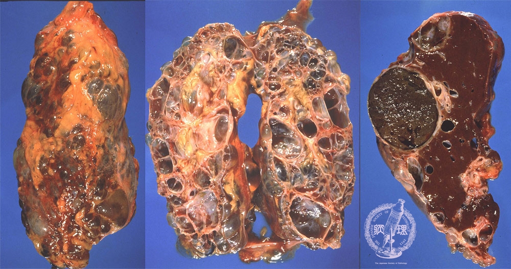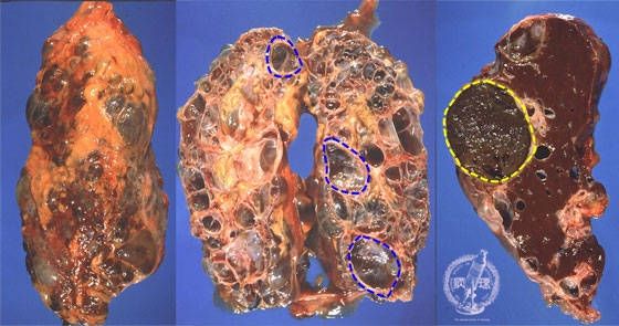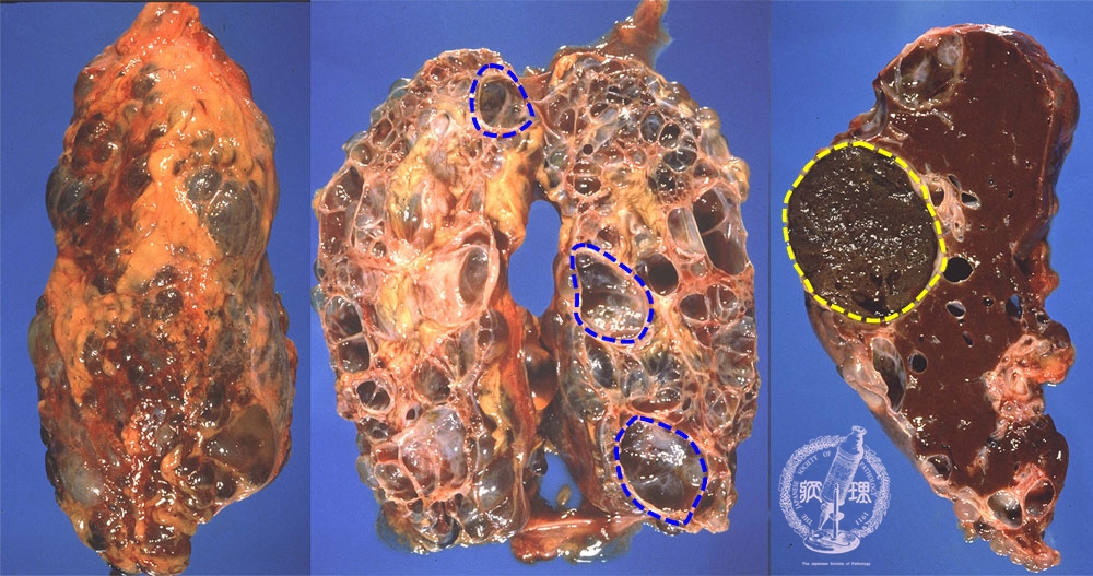 Gross findings (left: surface of the kidney, middle: cut surface of the kidney, right: cut surface of the liver): Autosomal dominant (adult type) polycystic kidney disease is a hereditary disease, in which the kidneys are enlarged with numerous cysts (blue dotted lines). In advanced stage, the patients develop renal failure. In addition to the renal disease, this disease causes multiple liver cysts (right) and intracranial aneurysms. The liver is also enlarged with various-sized cysts, which contain concentrated bile juice (yellow dotted line).In cases associated with intracranial aneurysm, attention should be paid for subarachnoid hemorrhage.