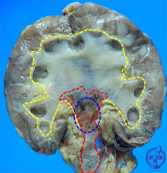 Gross findings: The kidney presents marked dilatation of the pelvis (yellow dotted line). There is an elevated mass (blue dotted line) in the pelvicoureteric junction (red dotted line). The mass is histologically urothelial carcinoma, which causes stenosis of the urinary flow and increased intrapelvic pressure with subsequent hydronephrosis.