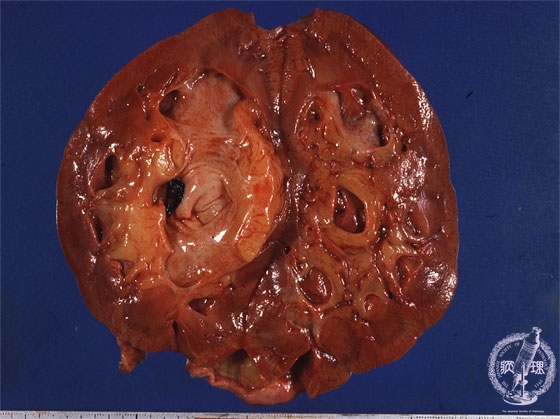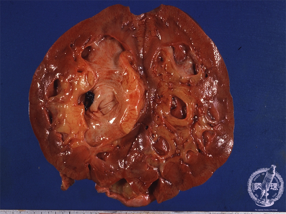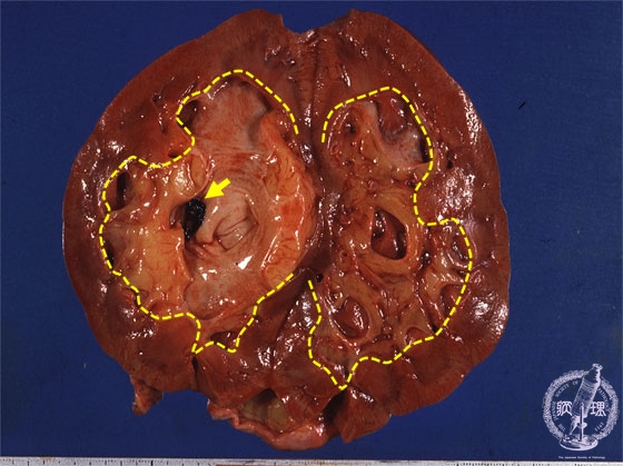 Gross findings: The renal pelvis contains a black-colored concretion (yellow arrow). This case also presents hydronephrosis. Note the dilated pelvis (yellow dotted line).