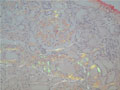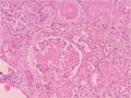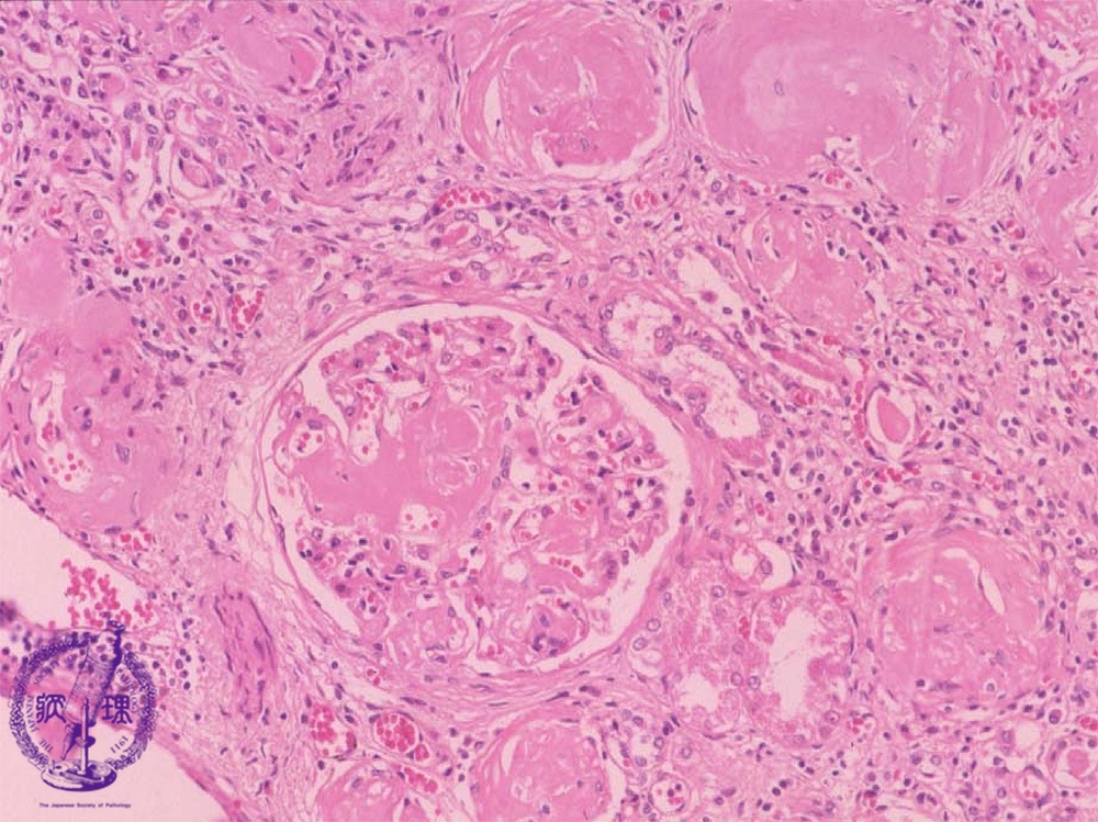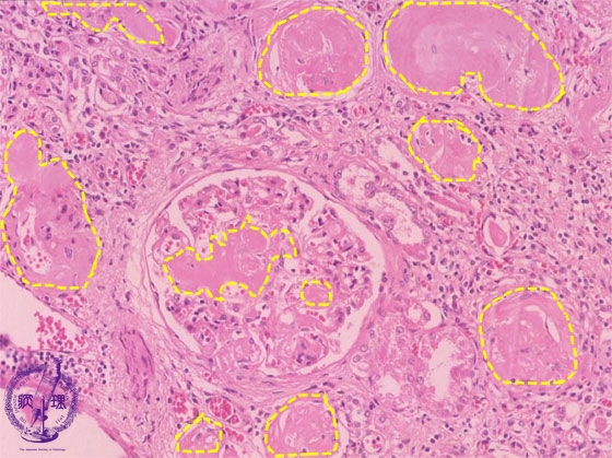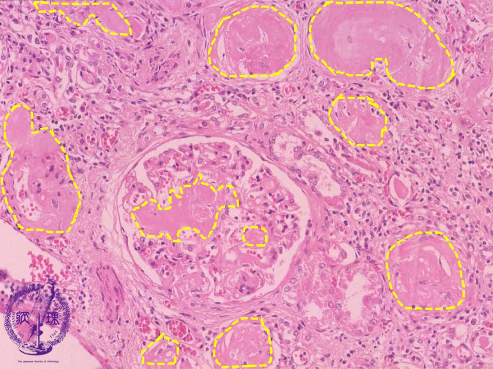 Microscopic findings (HE, middle power view):Eosinophilic and homogenous substance (amyloid) is deposited in the glomeruli and perivascular regions (yellow dotted lines).