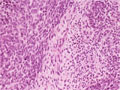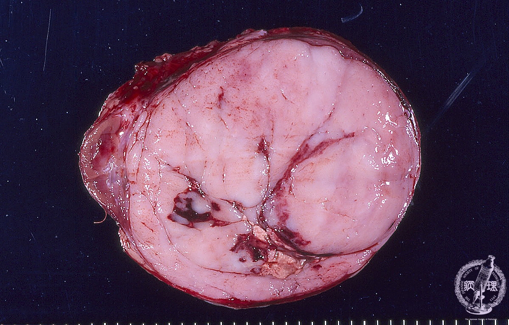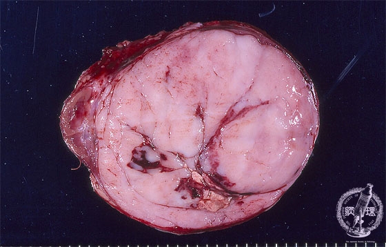 Gross findings: The tumor is grayish-white in color and myxoid, referred as a “ fish flesh”-like. The cut surface also presents focal hemorrhage and necrosis (blue arrows).Nephroblastoma is a most common primary renal tumor of childhood, occasionally associated with congenital anomalies. Immunohistochemically,WT1 is positive.