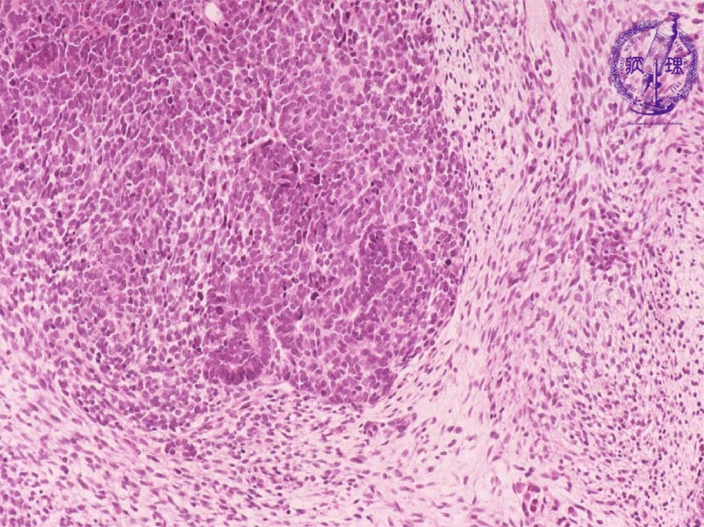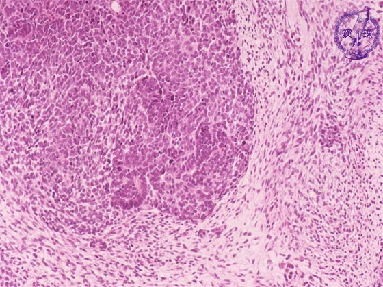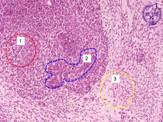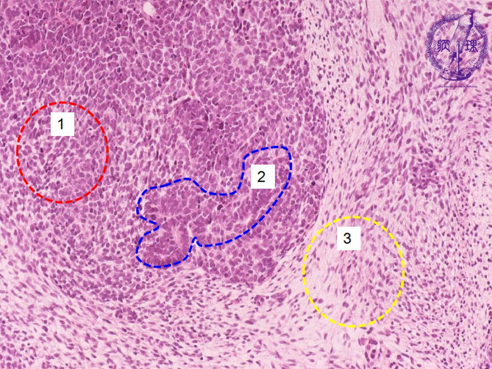 Microscopic findings ( HE, middle power view): Th tumor is composed of (1) blastemal, (2) organoid and (3) stromal elements (each shown by dotted lines).