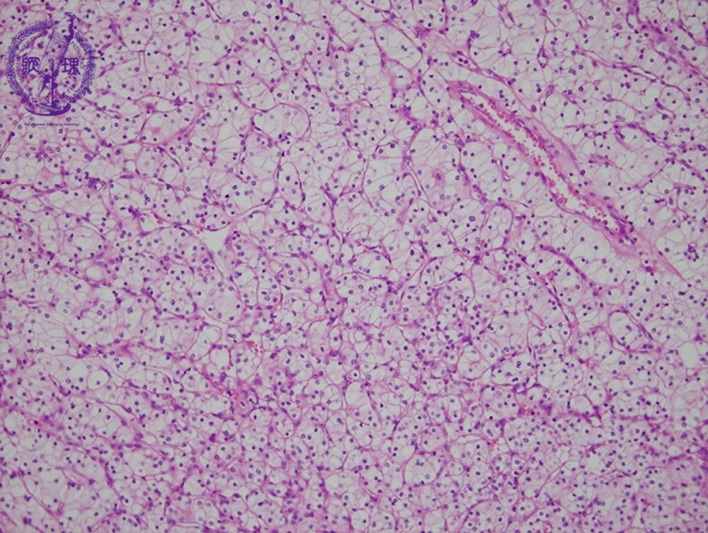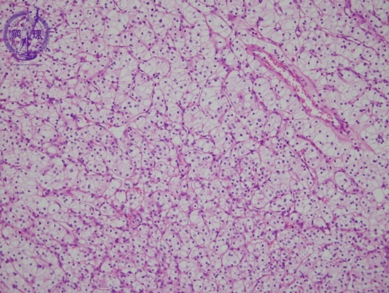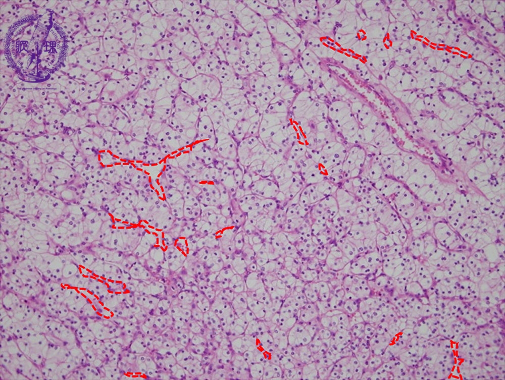 Microscopic findings ( HE, middle power view): Renal cell carcinoma (clear cell carcinoma). The tumor cells are arranged in an alveolar manner associated with a fine sinusoid-like capillary network (red dotted lines).