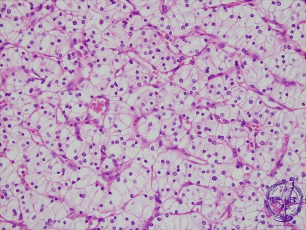 Microscopic findings (HE, high power view): Renal cell carcinoma (clear cell carcinoma). The tumor cells possess clear cytoplasm containing abundant glycogen and lipid.