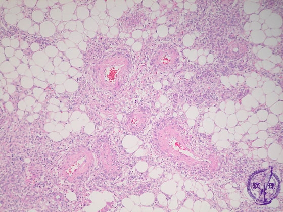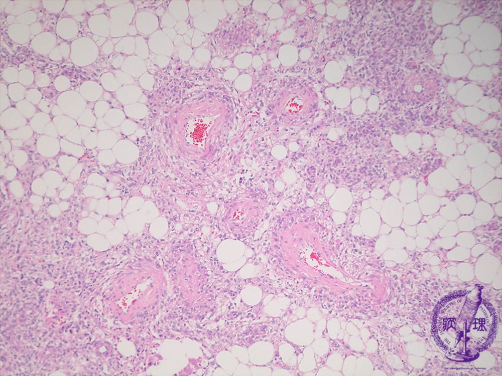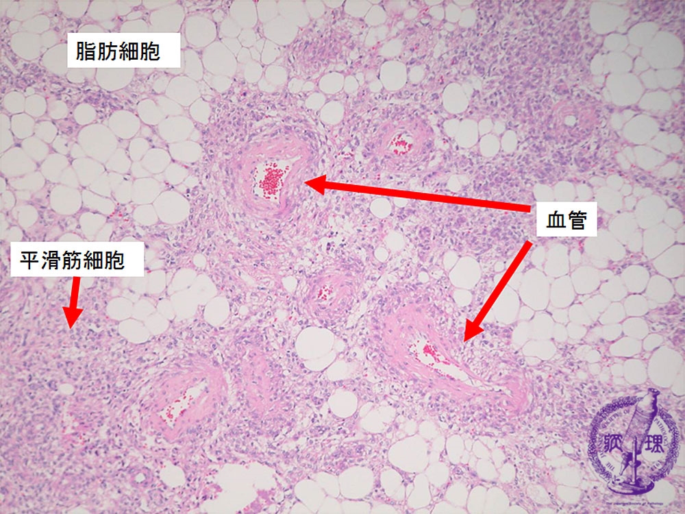 Microscopic findings ( HE, middle power view): The tumor contains adipose tissue, thick-walled blood vessels and smooth muscle-like spindle cells.
