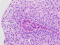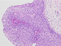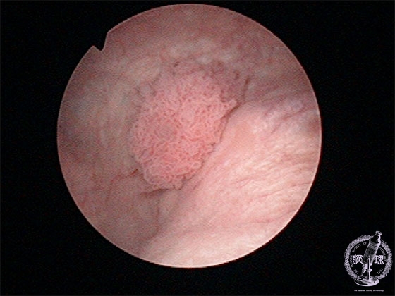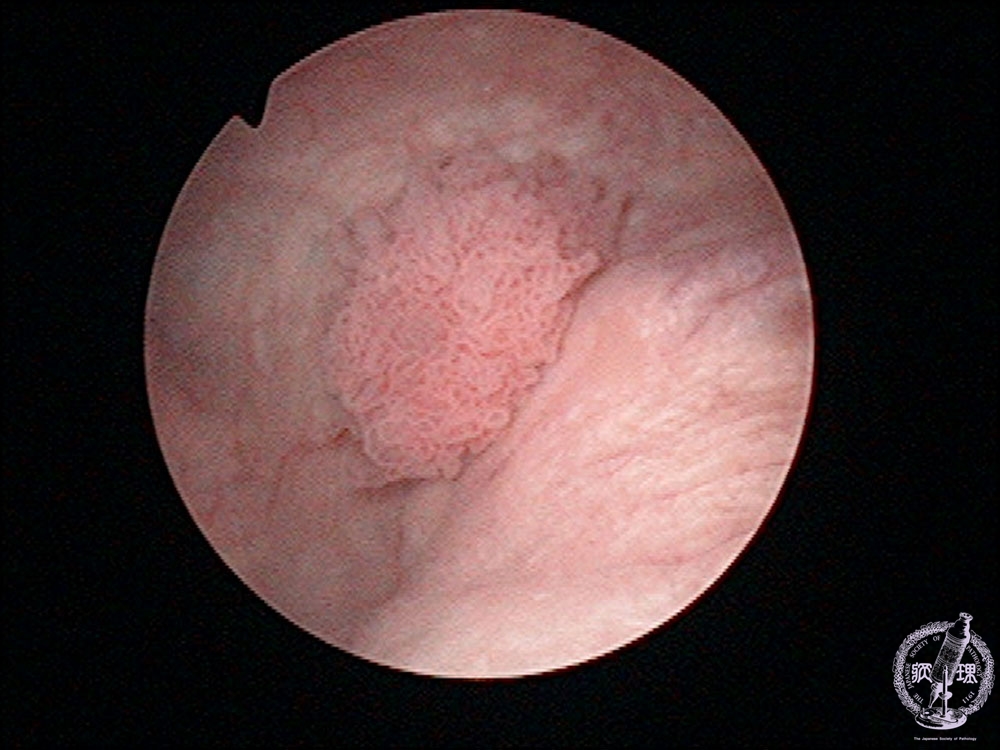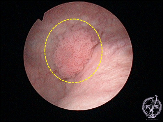 Gross findings: The cystoscopy revealed a papillary urothelial (transitional cell) carcinoma (encircled by a yellow dotted line).
