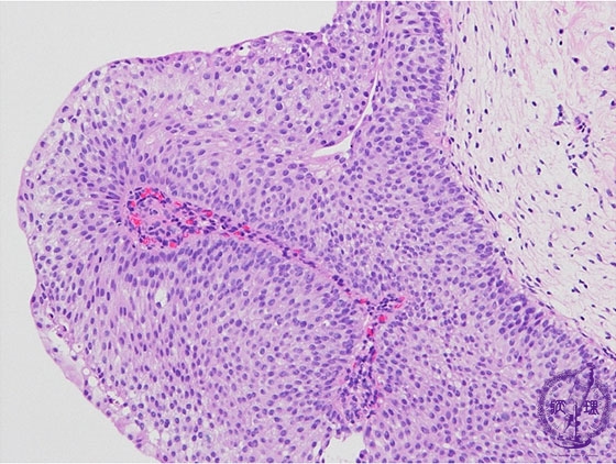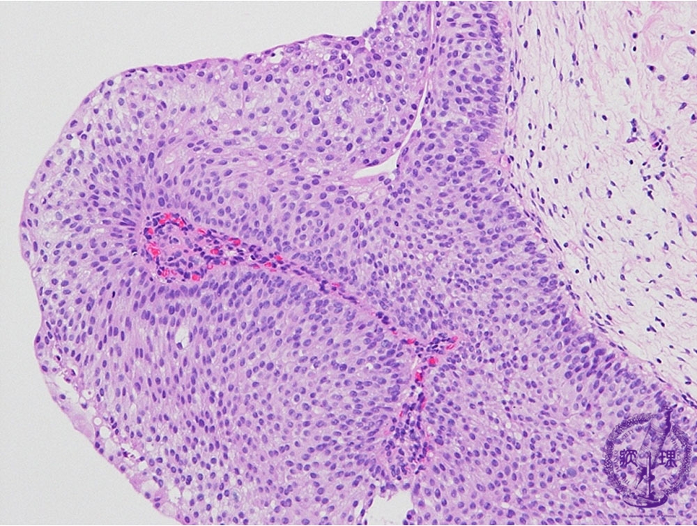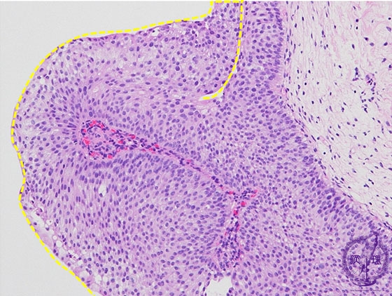 Microscopic findings (HE, intermediate power view): Although most of urothelial carcinoma shows a exophytic papillary growth (yellow dotted line), some cases show inverted proliferation. According to the nuclear atypism, urothelial carcinoma is classified into three grades; Grade 1 (low grade), Grade 3 (high grade). In Grade 1 case, the neoplastic urothelial cells present a multilayered growth exceeding seven layers.