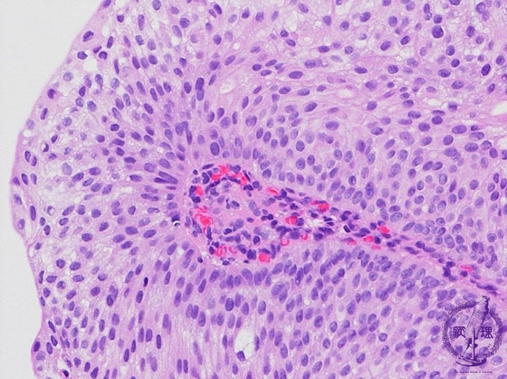 Microscopic findings (HE, high power view): G1, The neoplastic epithelial cells shows multilayered pattern more than seven.