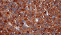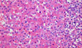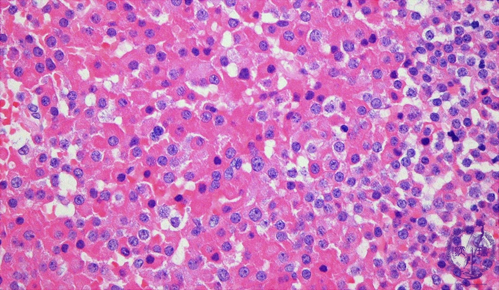 Microscopic findings (HE stain, high power view). Growth hormone producing pituitary adenoma. Tumor cells with eosinophilic cytoplasm are arranged in sheet-like architecture.
