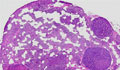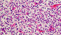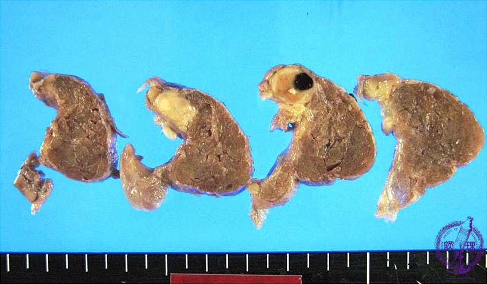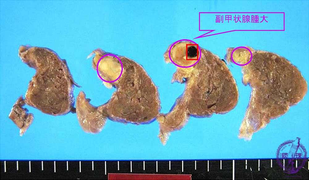 Macroscopic findings. Secondary parathyroid hyperplasia. Enlarged parathyroid nodule, 1cm in diameter (purple line), with focal hemorrhage (red line).