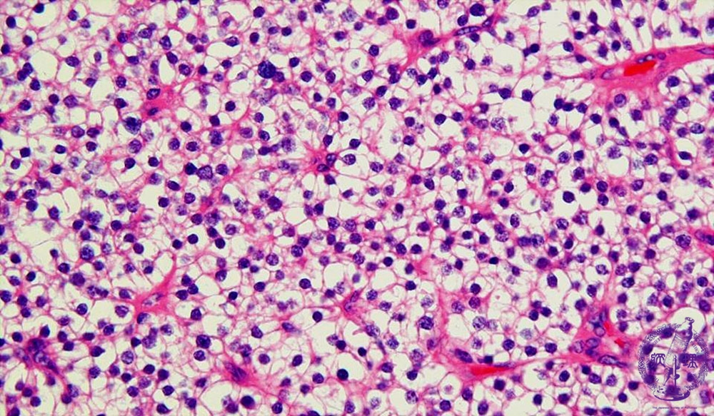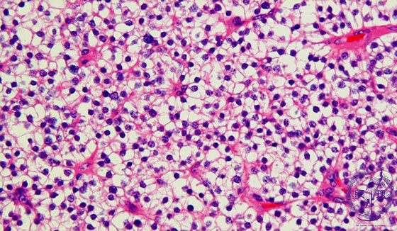 Microscopic findings (HE stain, high power view). Chief cell adenoma of the parathyroid. The tumor cells with a clear cytoplasm proliferated in a uniform fashion. This proliferation is associated with the intratumoral blood vessels.
