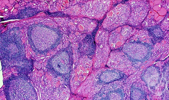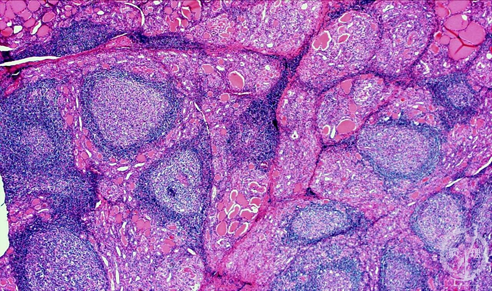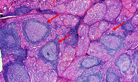 Microscopic findings (HE stain, low power view). Lymphoid follicles (arrows) with germinal center and atrophic thyroid follicles are apparent in the thyroid.