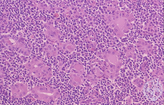Microscopic findings (HE stain, high power view). Marked lymphocytic infiltration in the thyroid. Thyroid follicular cells are enlarged with oxyphilic cytoplasm (arrows).